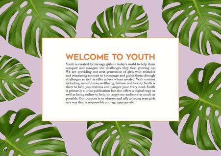 Youth magazine is a conceptual proposal for a publication targeted at young teenage girls with a focus on lifestyle, wellbeing and beauty content. It promotes positivity and encourages individuals to be strong and unique in a world that is filled with pressures and others opinions. It targets the teens themselves, the parents and also looks to be stocked in schools to create a three way communication channel, encouraging positivity across each girls life. All imagery seen here is created and designed by myself.